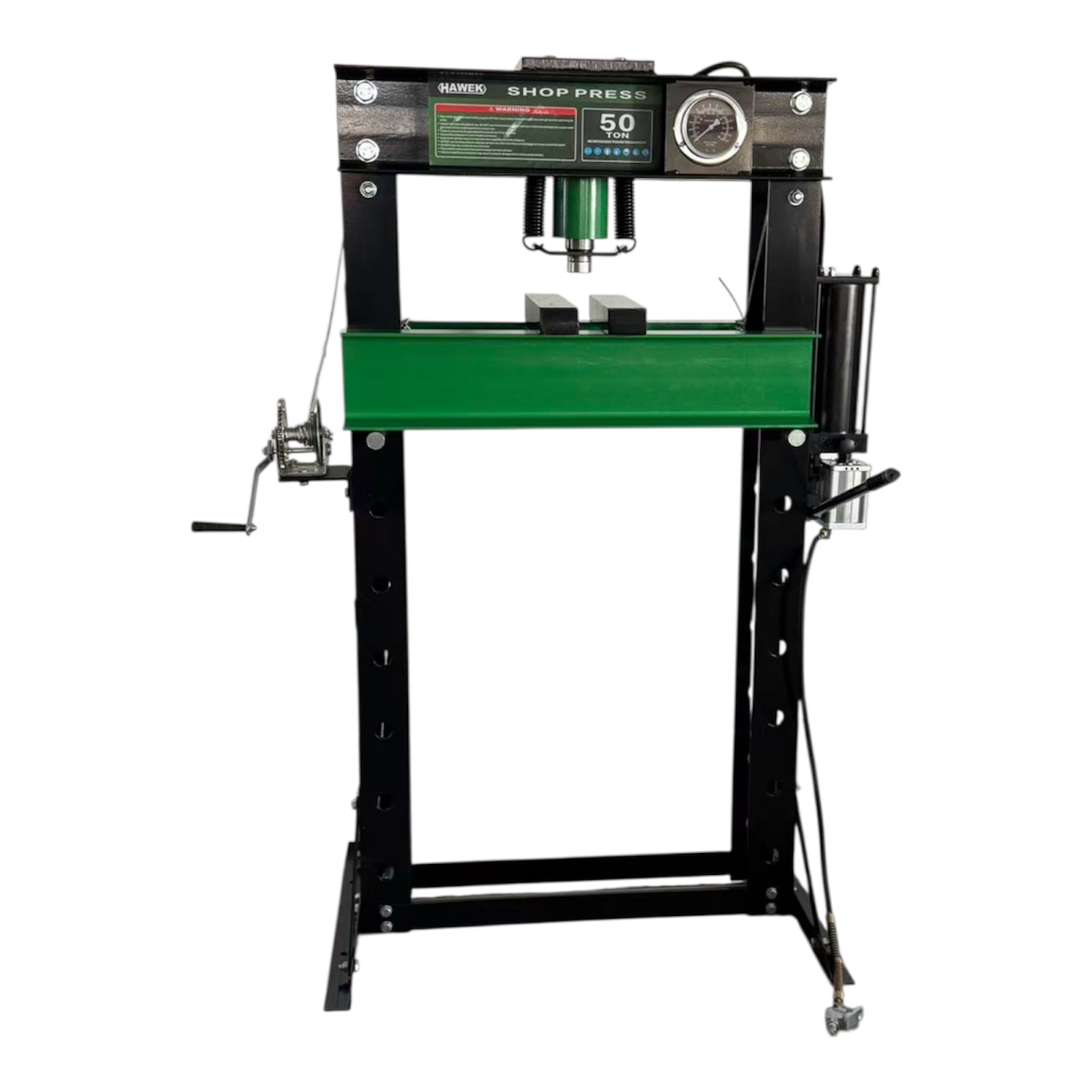 Пневмо-хидравличната подова преса HAWEK 50 тона е високоефективно оборудване, предназначено за професионална работа при пресоване, огъване, монтаж и демонтаж на лагери, втулки и тежки метални детайли. Подходяща е за автосервизи, индустриални предприятия и професионални работилници.